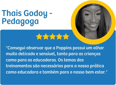 Todas as educadoras poppins são formadas em pedagogia, psicologia ou letras e possuem no mínimo 3 anos de experiência. Elas passam por um rigoroso processo seletivo antes de se tornarem poppins e uma vez dentro da nossa empresa possuem acesso a treinamentos diversos com foco no desenvolvimento infantil e por isso estão em constante evolução.